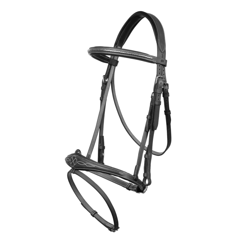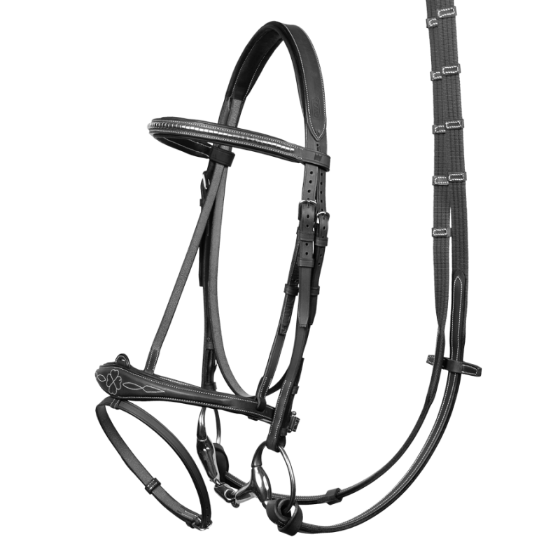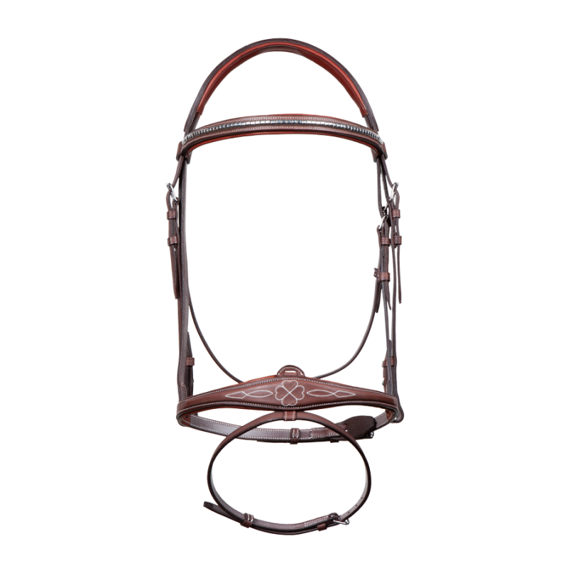 Harrie developed a bridle with a distinct style. The wide noseband provides better contact. A meticulous finish down to noseband’s stitching which represents a four-leaf clover, a universal symbol of good luck.
