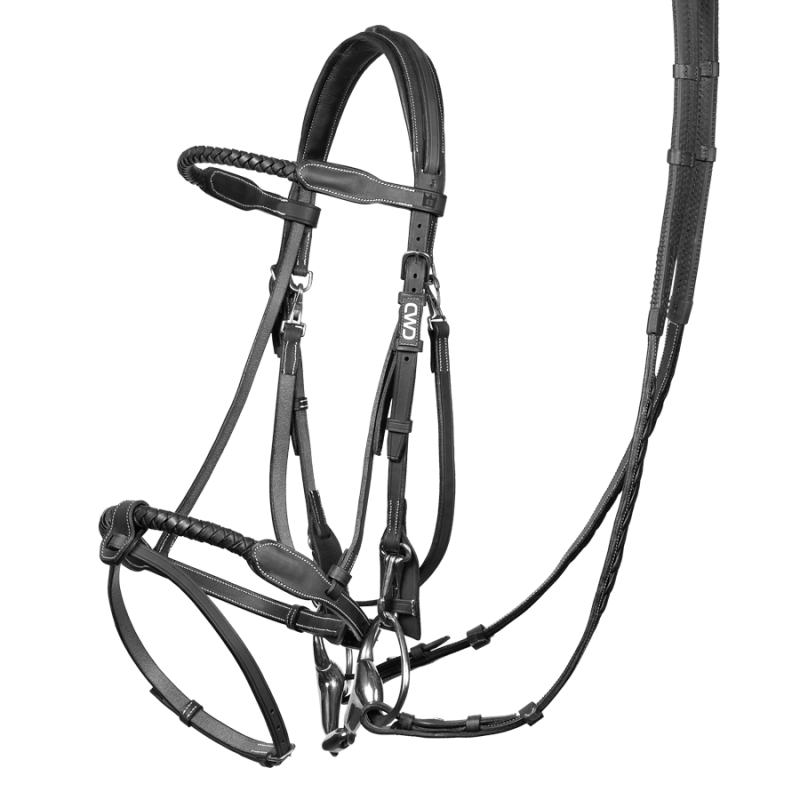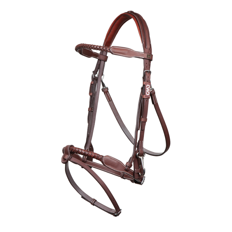 Kévin a développé un bridon à son image. Pratique par la facilité de changement de muserolle grâce au passage au-dessus de la têtière. Un bridon adaptable à tous les chevaux, au look tressé caractéristique du style Kévin Staut.